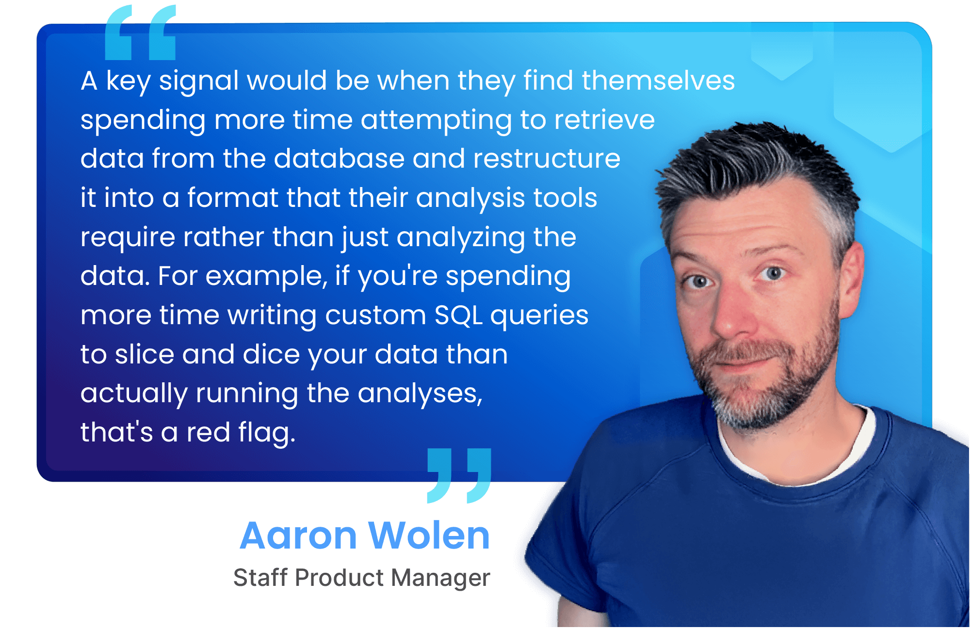 Wolen: A key signal would be when you find yourself spending more time attempting to retrieve data from the database and restructure it into a format that their analysis tools require rather than just analyzing the data. For example, if you're spending more time writing custom SQL queries to slice and dice your data than actually running the analyses, that's a red flag.