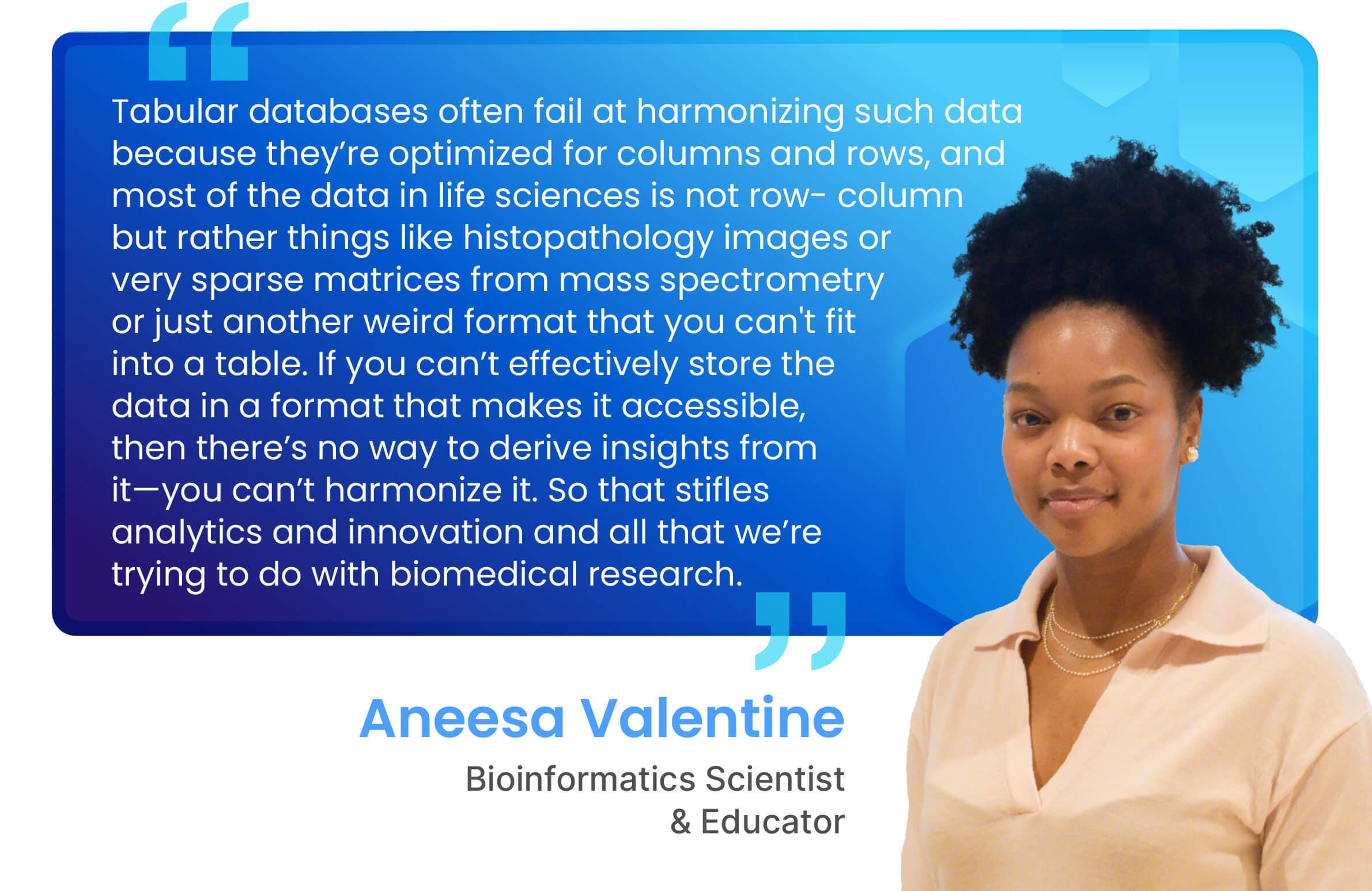 Before you can identify the right targets for discovery or build sophisticated machine-learning models, you need all your data in a usable format. But while life sciences data has always been diverse, the rise of multimodal data from sources like genomics, transcriptomics and single-cell data has made the process of harmonizing data more complex than ever. To learn more about this challenge and how TileDB’s multidimensional arrays are addressing it, we interviewed Aneesa Valentine, a Solutions Architect on our field engineering team.