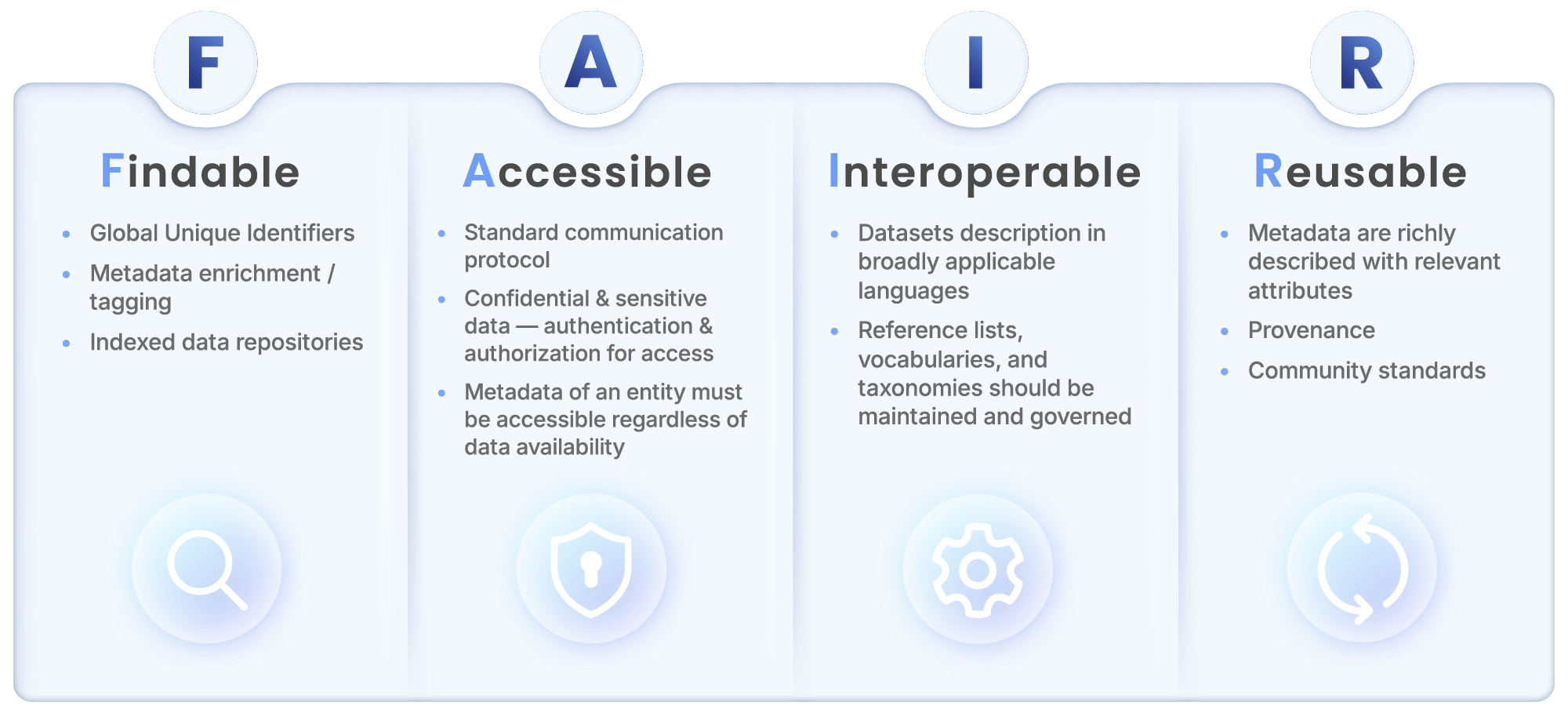 Accessible: Data must be retrievable by users through standardized communication protocols, even if the data is restricted to select users and behind secure authentication and authorization layers. In this case, restricted data should have clear permissions so users know the path to access. The Accessible principle is key to implementing infrastructure that supports controlled data access at scale, ensuring the right people can access the right data without compromising security or compliance.