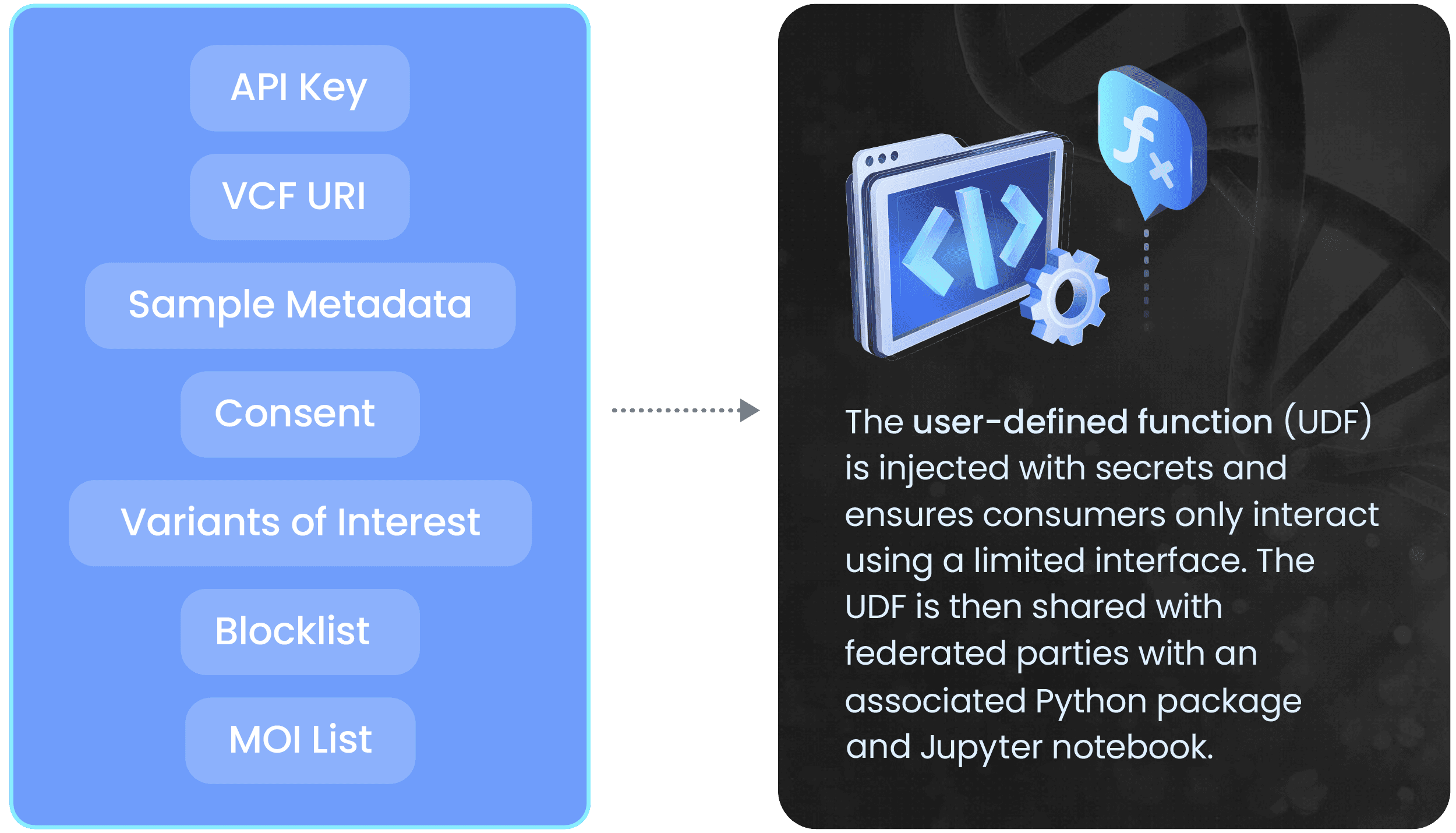 Here’s an overview of how TileDB enables federated queries for BeginNGS by protecting sensitive genomic data with a limited user-defined function (UDF).
