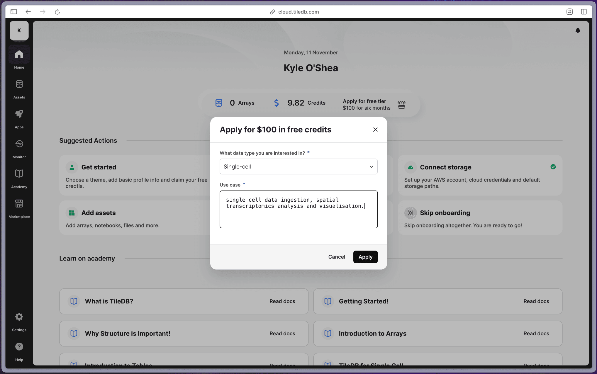 We have launched a new free tier for individual users on TileDB Cloud SaaS! This tier entails $100 in free credits for 6 months. This is a great opportunity for new users, to give you a chance to evaluate the product & all functionality in full, without having to worry about billing, and until you are ready to talk to our sales team.