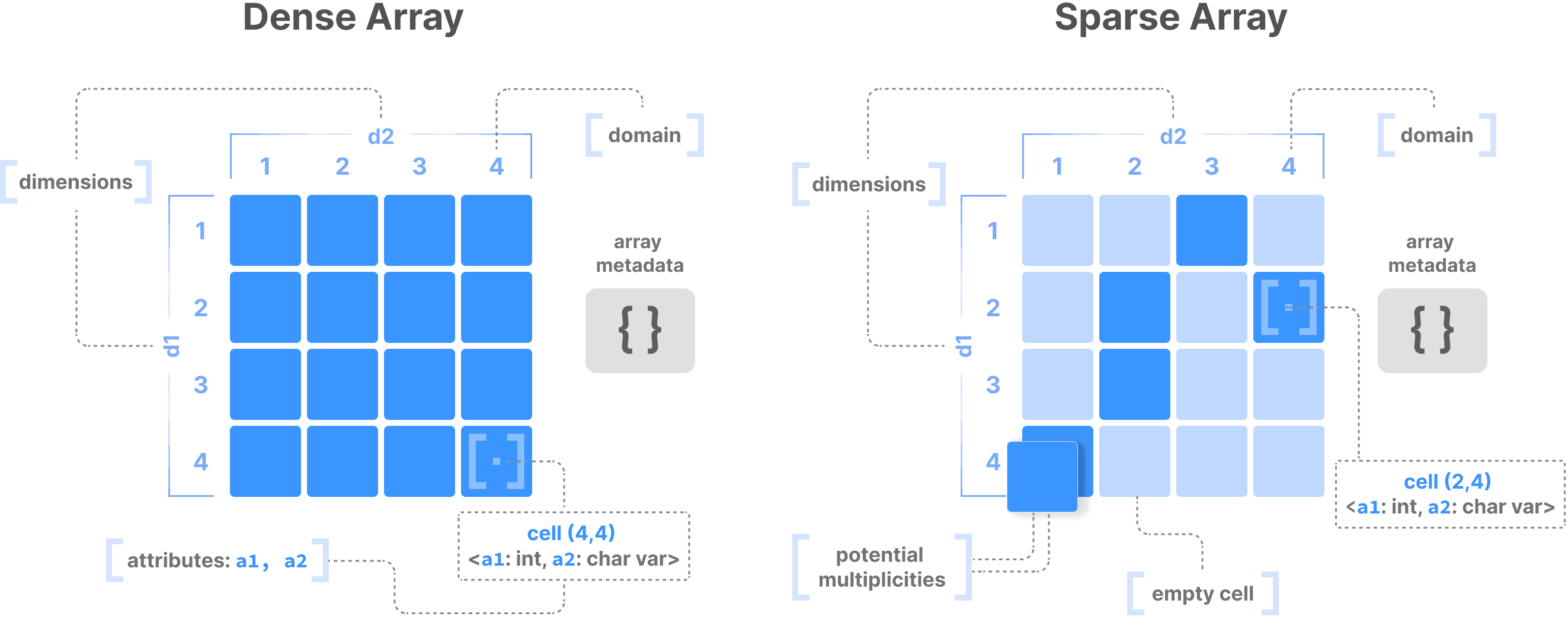 Sparse arrays: Only non-empty cells store values, ideal for naturally sparse data like single-cell matrices