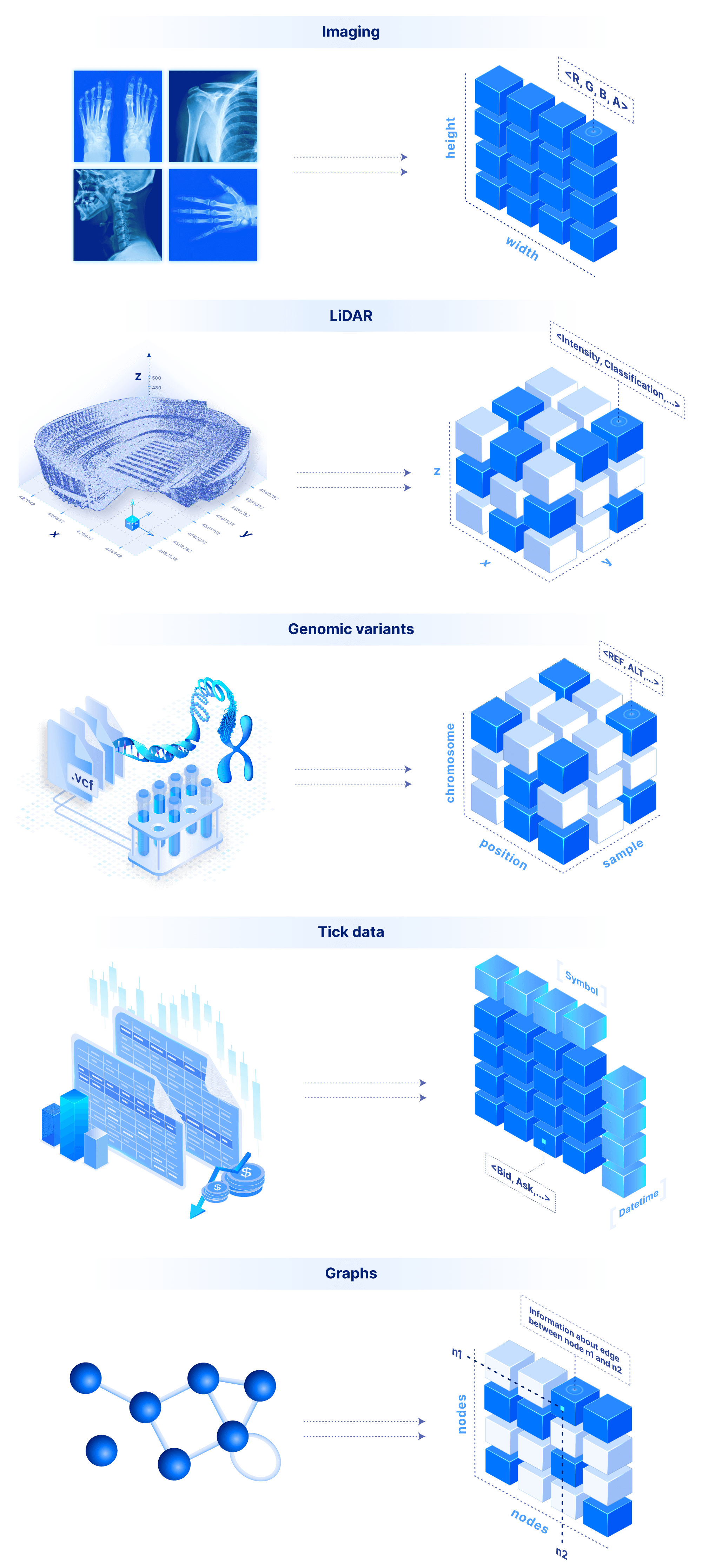 The sky is the limit in terms of applicability for a system that supports both dense and sparse arrays. An image is a 2D dense array, where each cell is a pixel that can store the RGBA color values. Similarly a video is a 3D dense array, two dimensions for the frame images and a third one for the time. LiDAR is a 3D sparse array with float coordinates. Genomic variants can be modeled by a 3D array where the dimensions are the sample name (string), the chromosome (string) and the position (integer). Time series tick data can be modeled by a 2D array, with time and tick symbol as labeled dimensions (this can of course be extended arbitrarily to a ND dense or sparse array). Similarly, weather data can be modeled with a 2D dense array with float labels (the lat/lon real coordinates). Graphs can be modeled as (sparse 2D) adjacency matrices. Finally, a flat file can be stored as a simple 1D dense array where each cell stores a byte.
