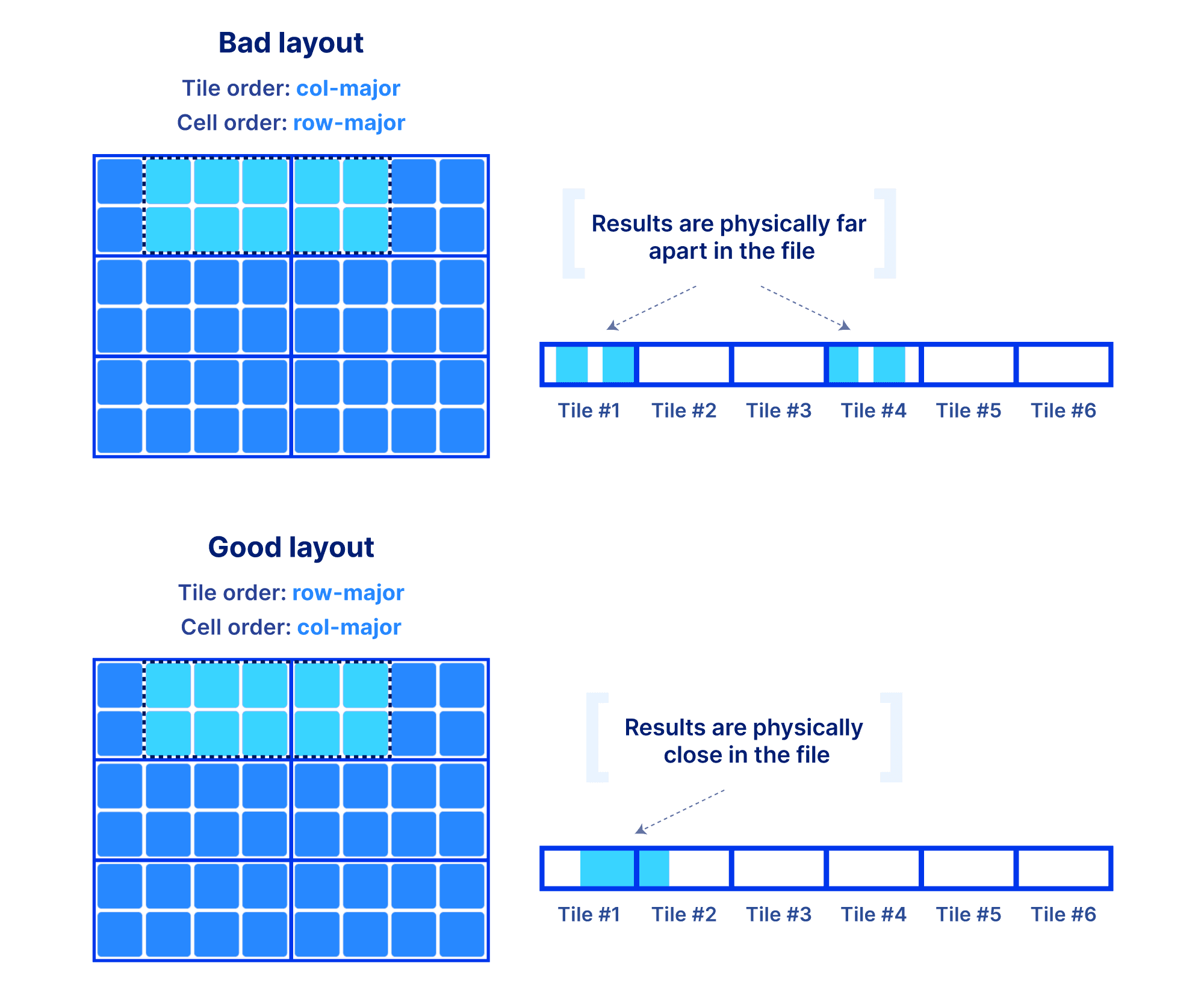 Why is the global order and tiling such a big deal? The global order should retain as much as possible the co-locality of your query results, for the majority of your typical slicing shapes. Remember, the array is multi-dimensional, whereas the file storing the array data is single-dimensional. You have a single chance (unless you want to pay for redundancy) to sort your data in a single 1D order. And that order absolutely dictates the performance of your multi-dimensional queries. The reason is that the closer your results appear in the file, the faster the IO operations to retrieve them. Also the size of the tile can affect performance, since integral tiles will be fetched from storage to memory. The examples below demonstrate some good and bad global orders and tilings for a given slice, focusing on a dense array (similar arguments can be made for the sparse case).