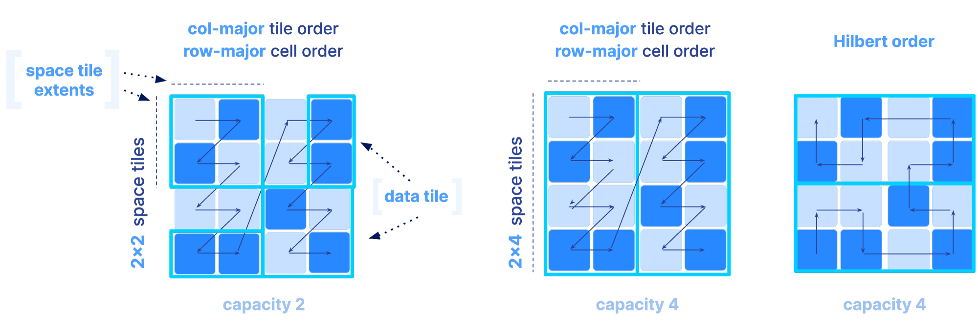 The figure below depicts three different orders as we vary the above parameters. Observe that the shape and size of each tile is dictated solely by the space tile extents.