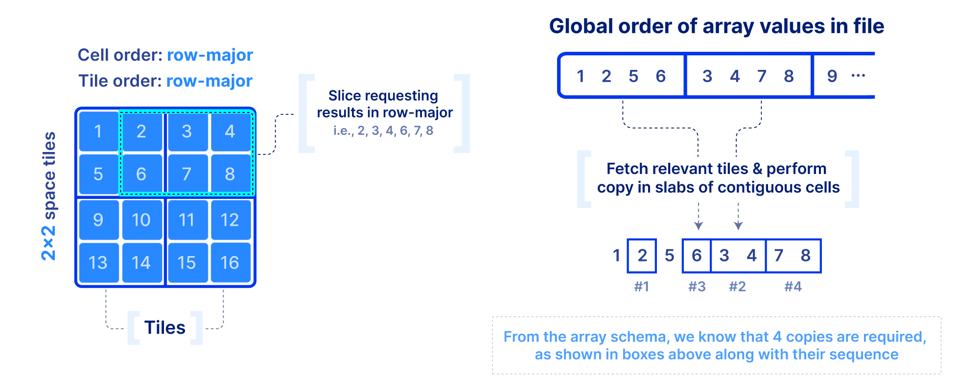 . Recall that dense arrays do not materialize the coordinates of the cells, and instead infer where the results are located from the array schema (i.e., dimensionality, global order and tiling). In an array engine, the array values would be serialized as 1, 2, 3, 4
