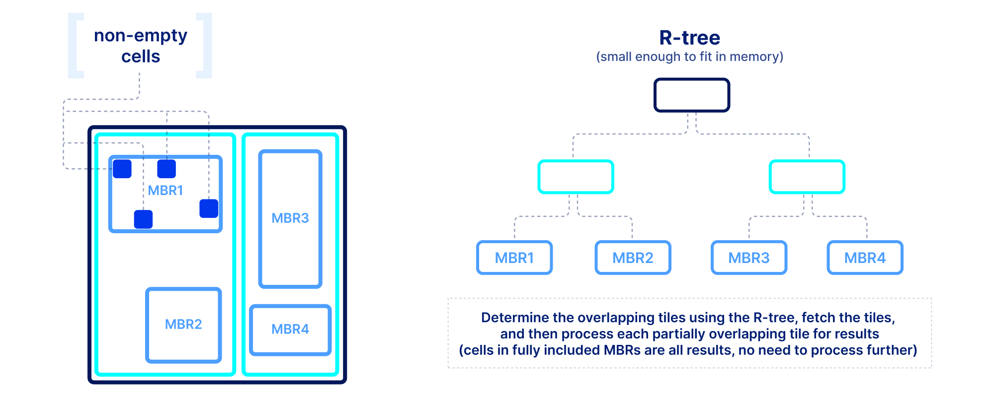 Slicing in sparse arrays is more difficult because we do not know the location of empty cells until the array is written. Therefore, unlike dense arrays, we need to explicitly store the coordinates of the non-empty cells, and build an index on top of them. The index must be small in size so that it can be quickly loaded in main memory when the query is submitted. In TileDB we use an R-tree as an index, but other multi-dimensional indexes exist. The R-tree groups the coordinates of the non-empty cells into minimum bounding rectangles (MBRs), one per tile, and then recursively groups those MBRs into a tree structure. The figure below shows an example. The slicing algorithm then traverses the R-tree to find which tile MBRs overlap the query, fetches in parallel those tiles from storage, and decompresses them. Then for every partially overlapping tile, the algorithm needs to further check the coordinates one by one to determine whether they fall inside the query slice. This simple algorithm, if developed efficiently (using multi-threading and vectorization), can lead to extremely efficient multi-dimensional slicing.