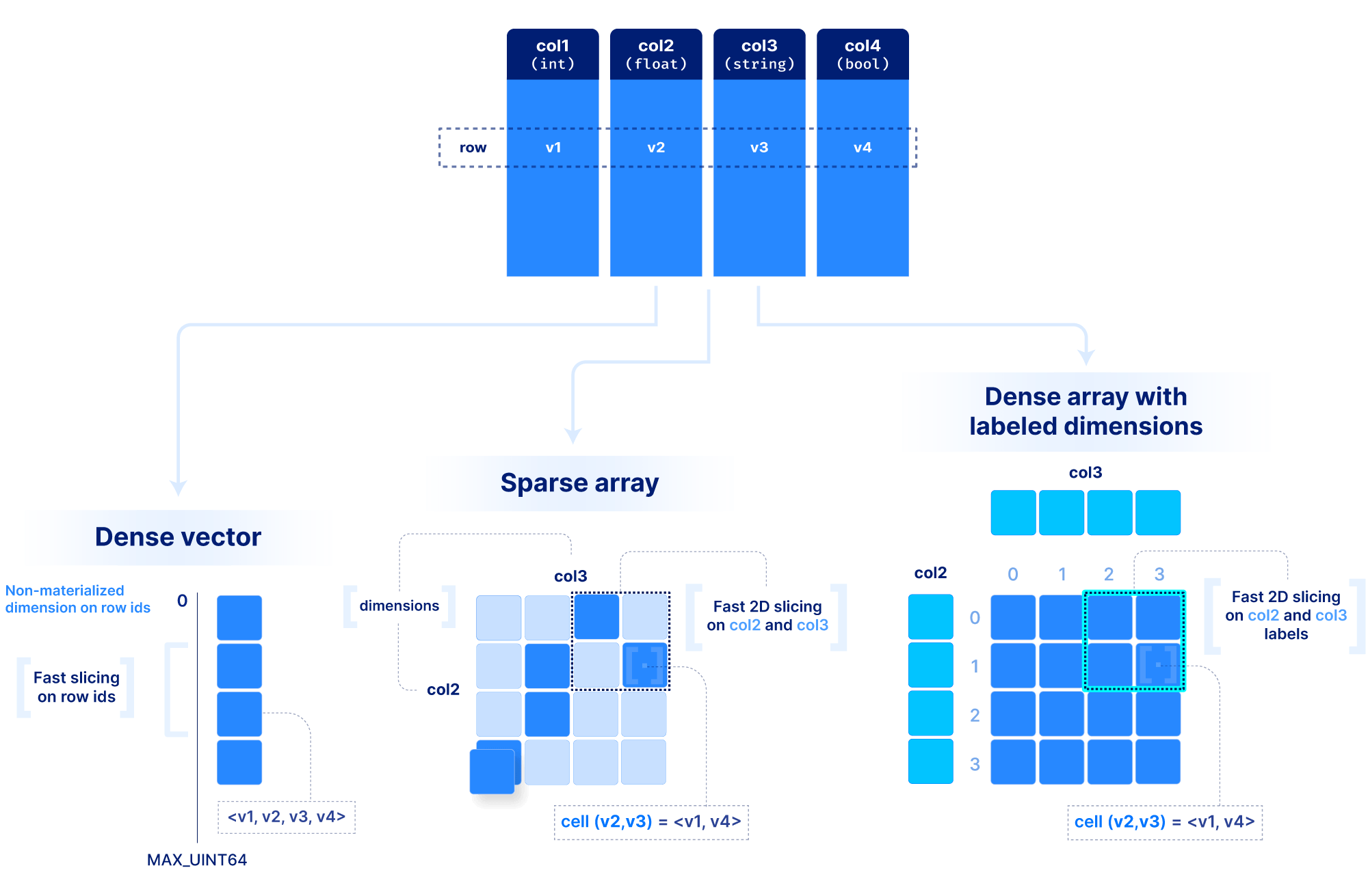 You may wonder how we can make all these decisions about dimensions vs. attributes and dense vs. sparse for each application. To answer that, we need to understand how dense and sparse arrays lay data out on the storage medium, and what factors affect performance when slicing, which is the focus of the next section.