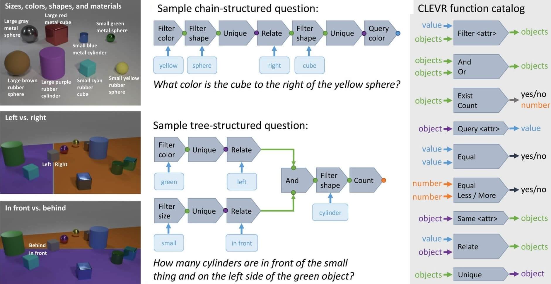 Figure 3: A field guide to the CLEVR universe. Left: Shapes, attributes, and spatial relationships. Center: Examples of questions and their associated functional programs. Right: Function catalog for building questions. (https://arxiv.org/pdf/1612.06890)