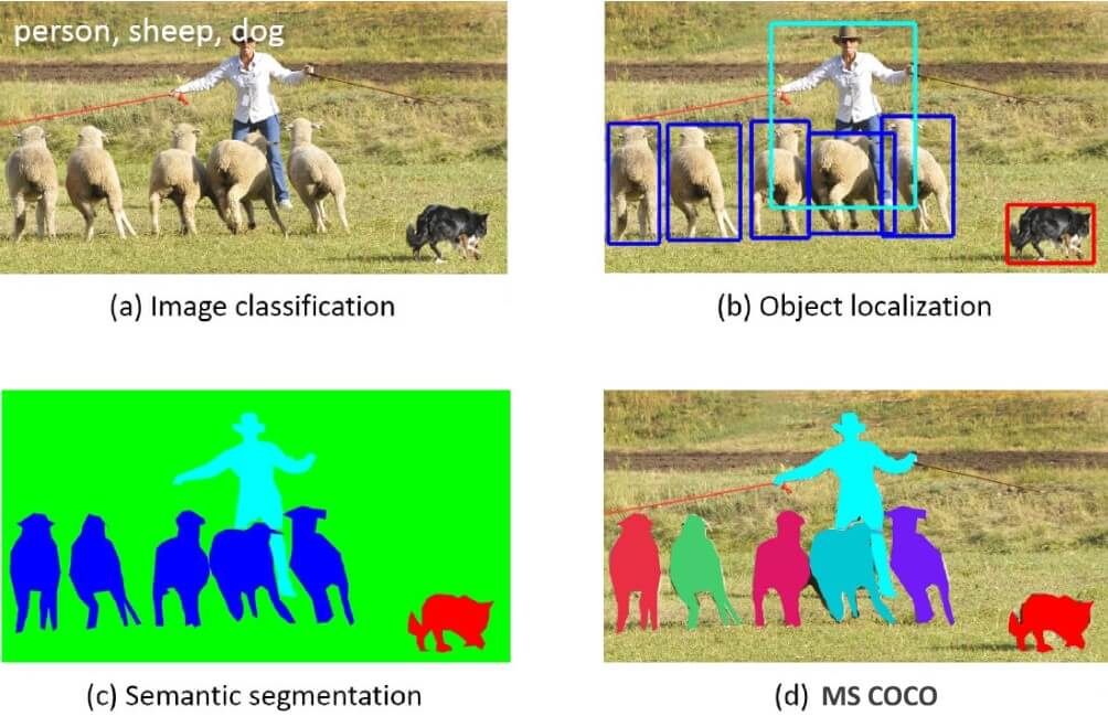 Figure 6: Previous object recognition datasets focus on (a), (b) and (c), MS COCO focuses on (d) segmenting individual object instances, by introducing a large, richly-annotated dataset comprised of images depicting complex everyday scenes of common objects in their natural context. (https://arxiv.org/pdf/1405.0312)