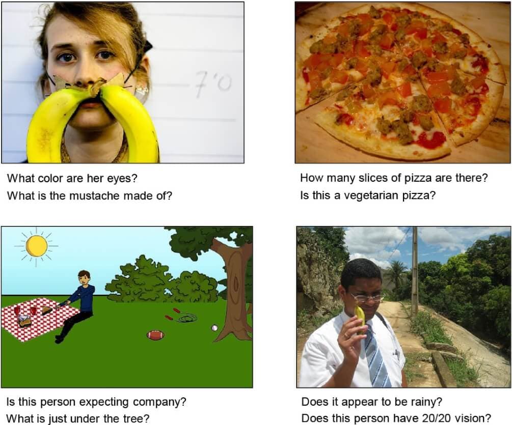 Figure 7: Examples of free-form, open-ended questions collected for images via Amazon Mechanical Turk. Note that commonsense knowledge is needed along with a visual understanding of the scene to answer many questions. (https://arxiv.org/pdf/1505.00468)