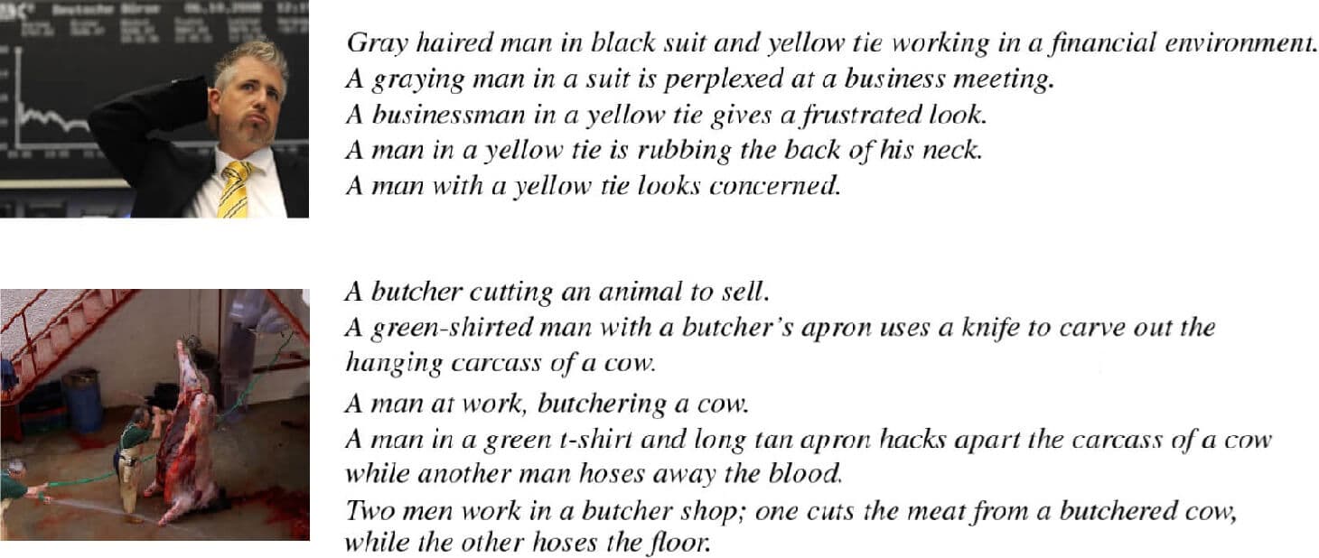 Figure 14: Two images from the data set and their five captions. (https://aclanthology.org/Q14-1006.pdf)