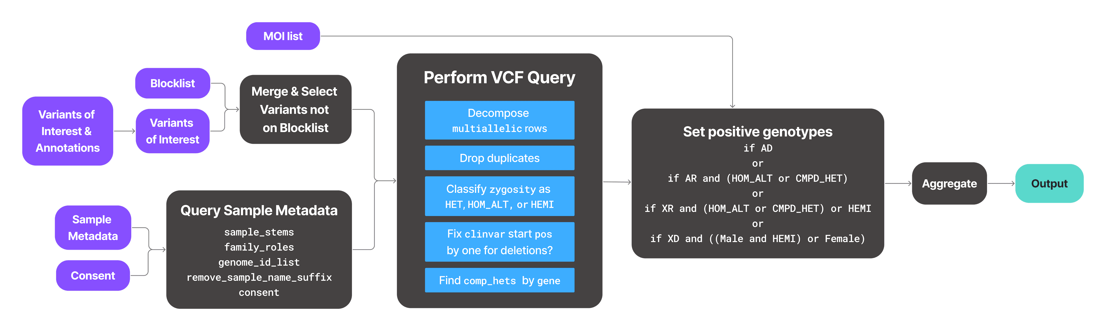 (currently BeginNGS v2, 53,855 P and LP variants that map to 342 genes, 412 SCGD and 1,603 SCGD therapeutic interventions) are normally encapsulated as a fixed resource in the UDF, but can be implemented as a parameter. This is pre-annotated with consequence and population frequency information, but only chr-pos-ref-alt is used for the query itself.