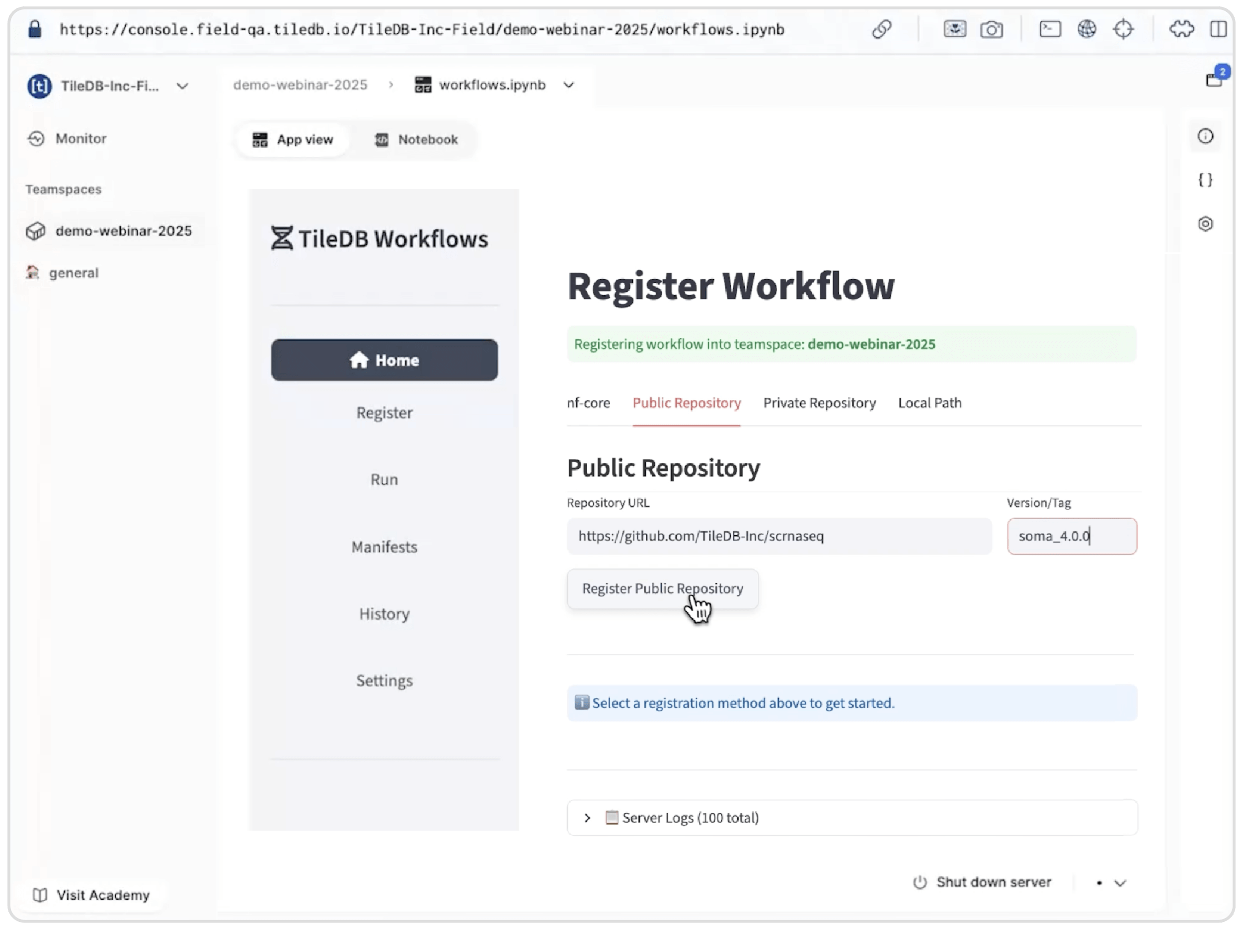 The workflow produces TileDB-SOMA output: a specialized array format optimized for single-cell expression data. We can immediately query this data in Carrara's revamped notebook environment, which provides both traditional notebook interfaces and streamlined dashboard views.