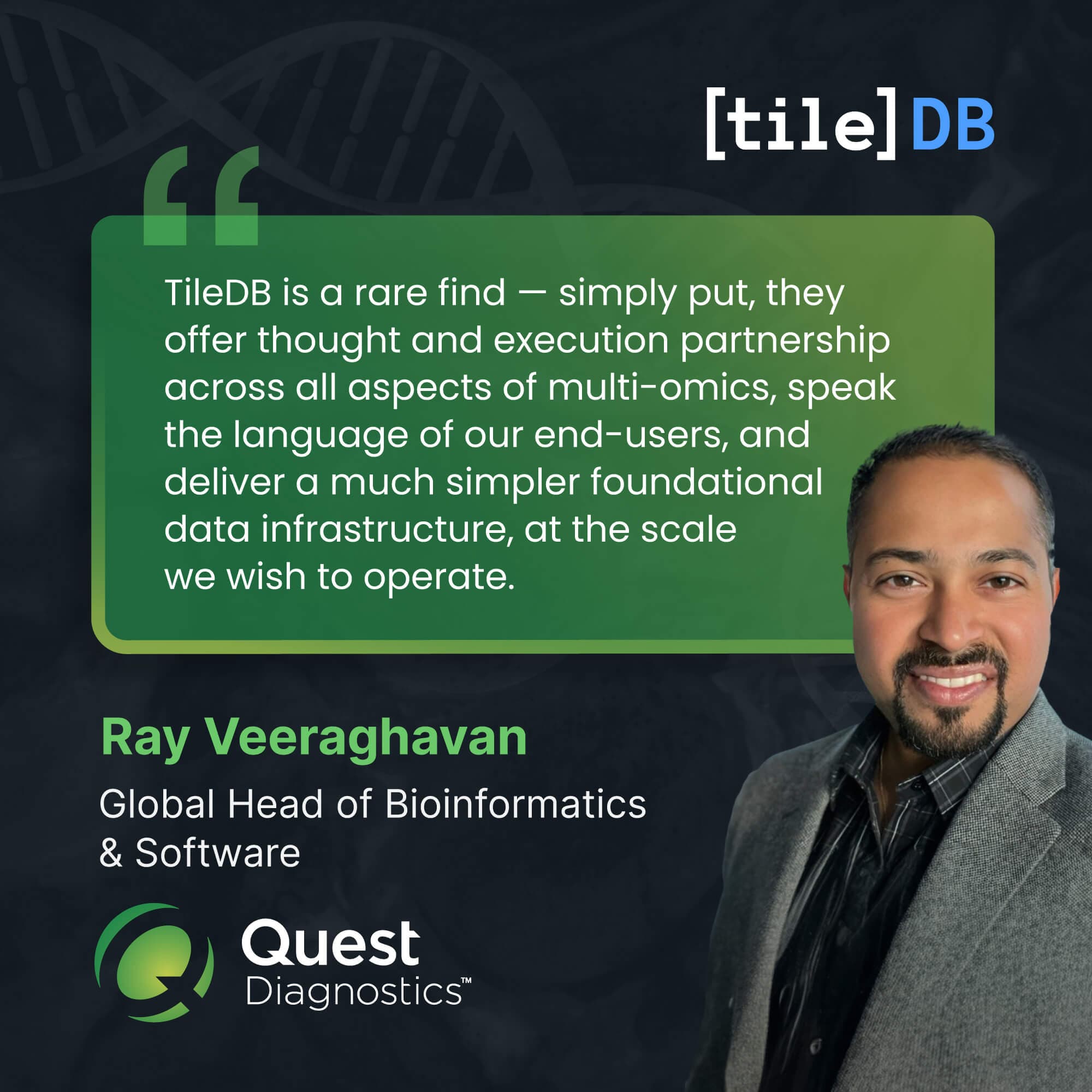 Enter TileDB. Beyond delivering FAIR and ML-ready genomics data in a unified data mesh across Quest’s research and bioinformatics teams, TileDB enabled Quest to ingest, store and scale up to 6 million samples per year of analysis-ready variant data—all while meeting DUO standards. “TileDB is a rare find. They offer thought and execution partnership across all aspects of multi-omics, speak the language of our end-users and deliver a much simpler foundational data infrastructure at the scale we wish to operate,” said Ray Veeraghavan, Global Head of Bioinformatics and Software at Quest Diagnostics.