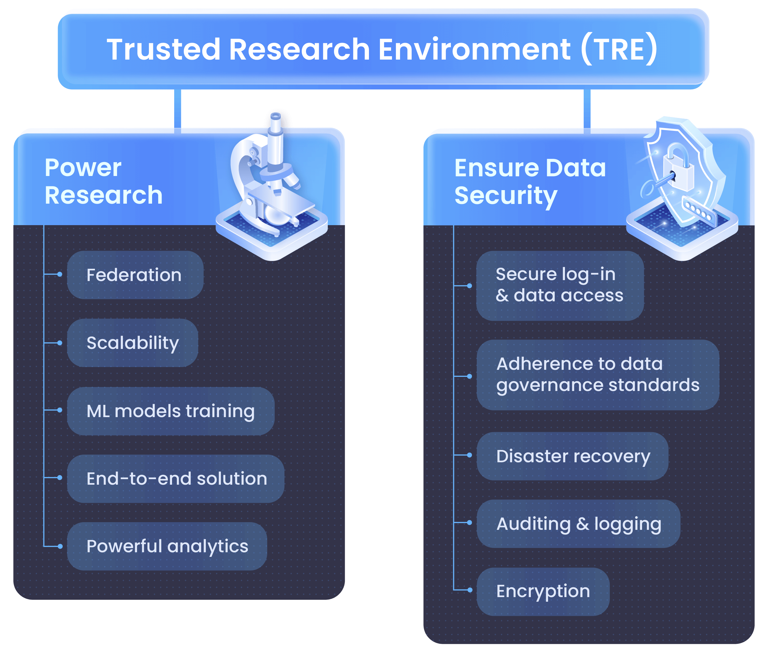 A trusted research environment (TRE) refers to highly secure and controlled computing infrastructure designed to give approved researchers remote access to sensitive biomedical data while protecting patient confidentiality. TREs are important to life sciences research because they provide safe remote access to useful data without compromising privacy or security. The core pillars of TREs are known as the 5 Safes framework, which are safe people, safe projects, safe settings, safe data, and safe outputs.