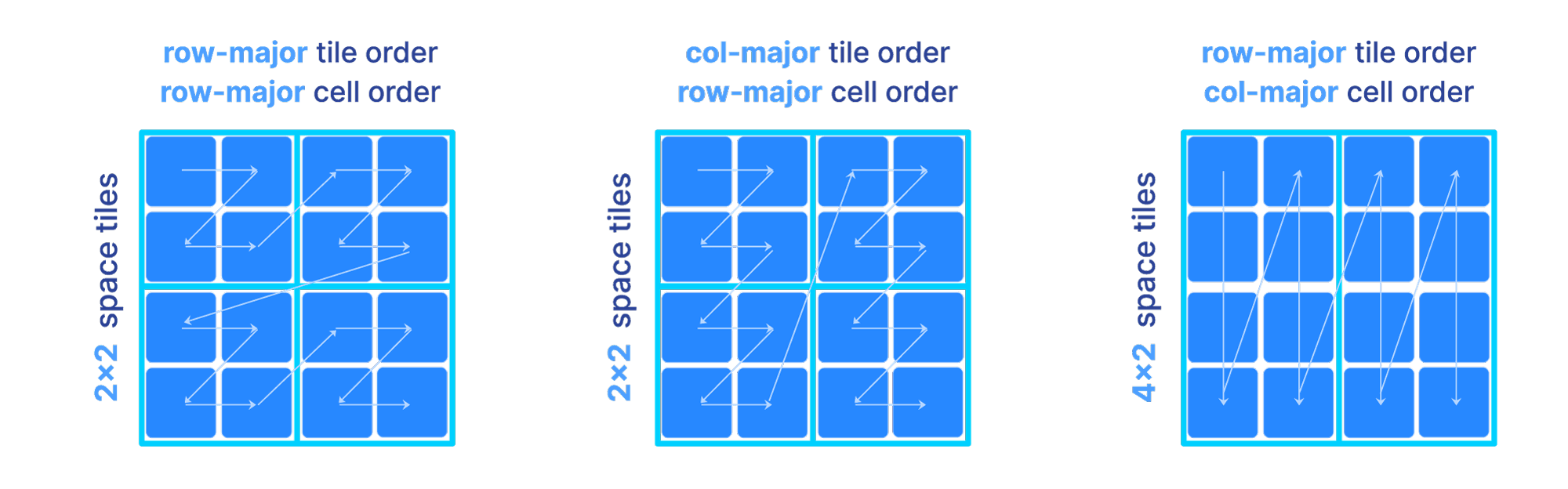 The figure below depicts three different orders as we vary the above parameters. Observe that the shape and size of each tile is dictated solely by the space tile extents.