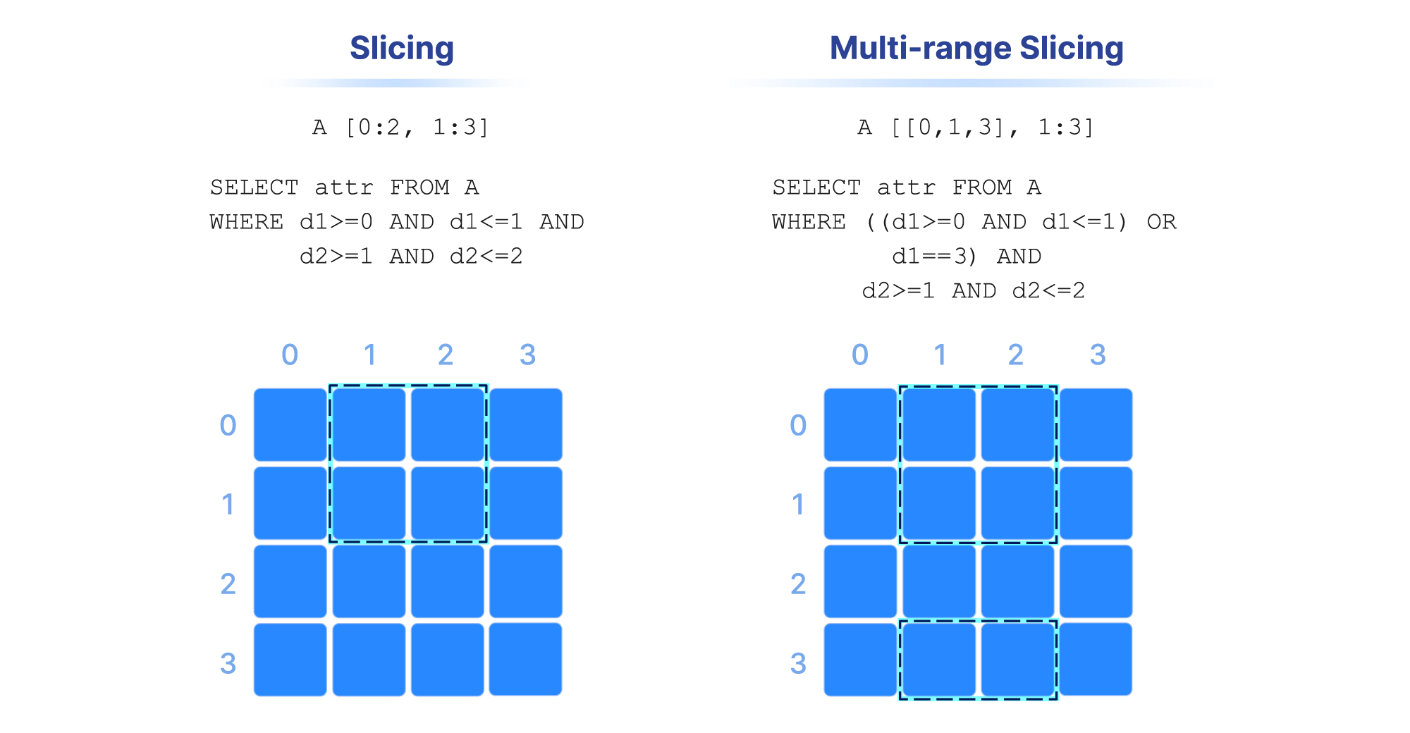 . Note also that slicing may contain more than one range per dimension (a multi-range slice/subarray).