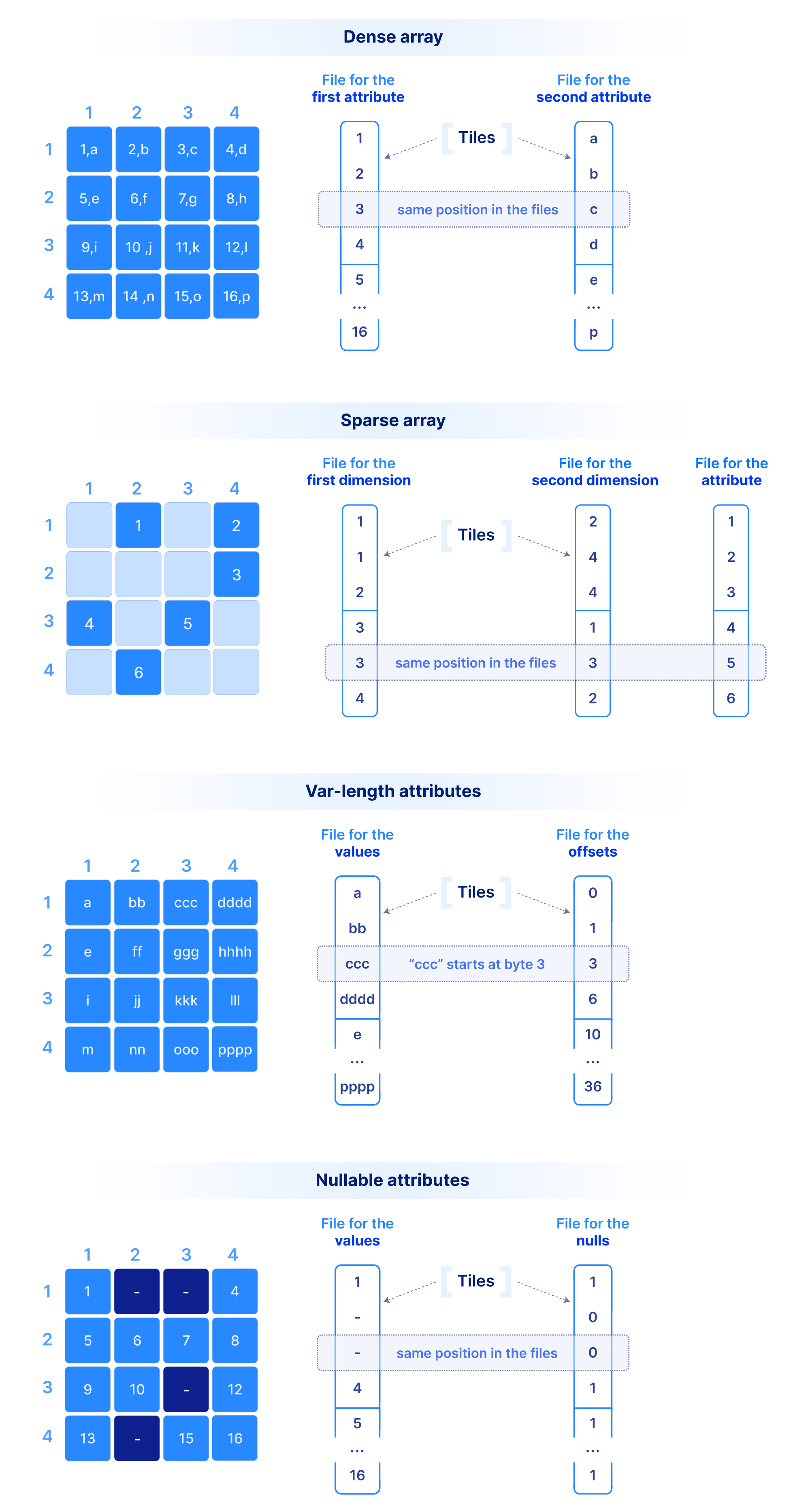 Let’s start with how we store the dimension coordinate and attribute values.In order to efficiently support cloud object stores and versioned writes, we have chosen a multi-file format, where the values along each dimension or attribute are stored in a separate file. A dense array does not materialize the dimension coordinates, whereas a sparse array must. The figure below shows a dense and a sparse array example. Observe that each cell value across all dimensions and attributes appears in the same absolute position across the corresponding files. Moreover, in variable-length attributes or dimensions, a separate file is needed to store the byte offset of where each value starts in the value file.