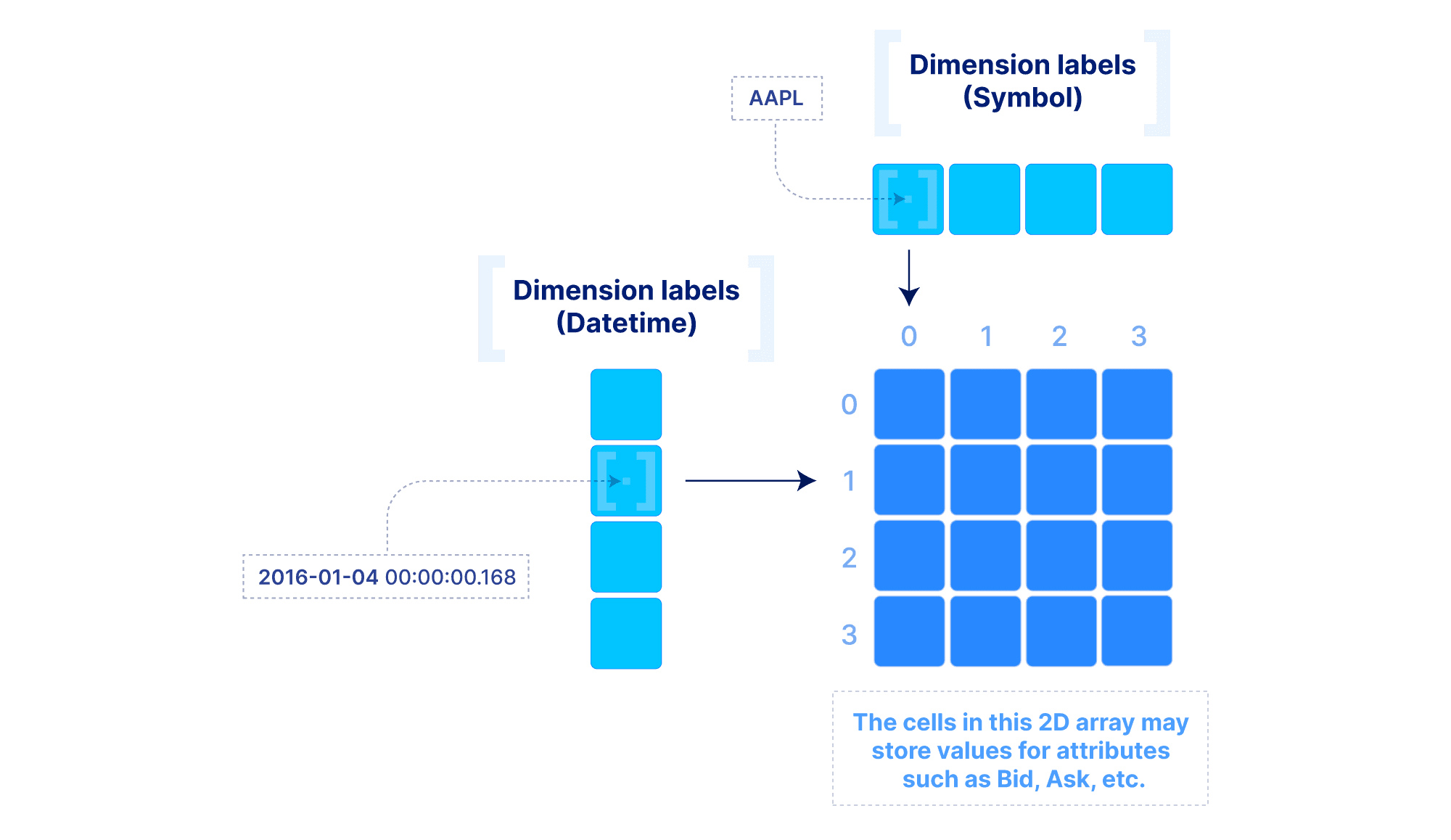 But what about tabular data? Arrays have a lot of flexibility here. In the most contrived scenario, we can store a table as a set of 1D arrays, one per column (similar to Parquet for those familiar with it). This is useful if we want to slice a range of rows at a time. Alternatively, we can store a table as a ND sparse array, using a subset of columns as the dimensions. That would allow rapid slicing on the dimension columns. Finally, we can use labeled dense arrays as explained above for the time series tick data.