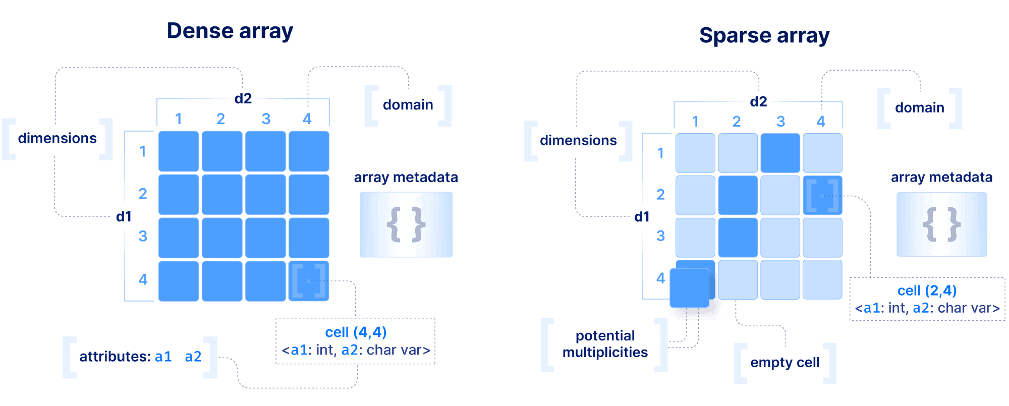 Dense vs. sparse. If all cells in the array must have a value, this array should be dense. If the vast majority of the cells are empty, the array should be sparse. If the array is rather dense, but the dimension coordinates take values from a non-integer domain or are non-contiguous integers, then the array should be dense with labeled dimensions.
