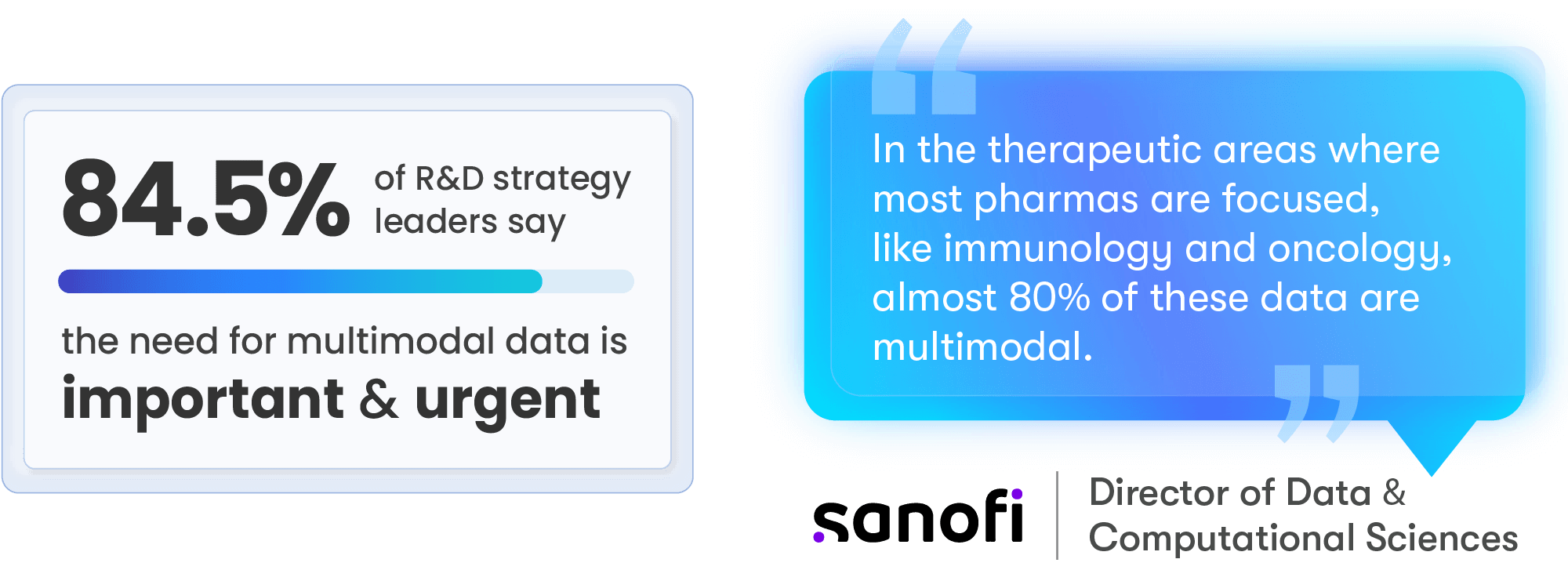 At the same time, three converging forces are creating a perfect storm that makes change a necessity. First, multimodal data has become vital to biotech and pharma research, as 84.5% of life sciences R&D leaders say using multimodal data in life sciences R&D strategy is both important and urgently needed. “In the therapeutic areas where most pharmas are focused, like immunology and oncology, almost 80% of these data are multimodal,” says a Director of Data and Computational Sciences at Sanofi. “You need this multimodal data to find biomarkers and to find your niche of patients compared to your competitors.”