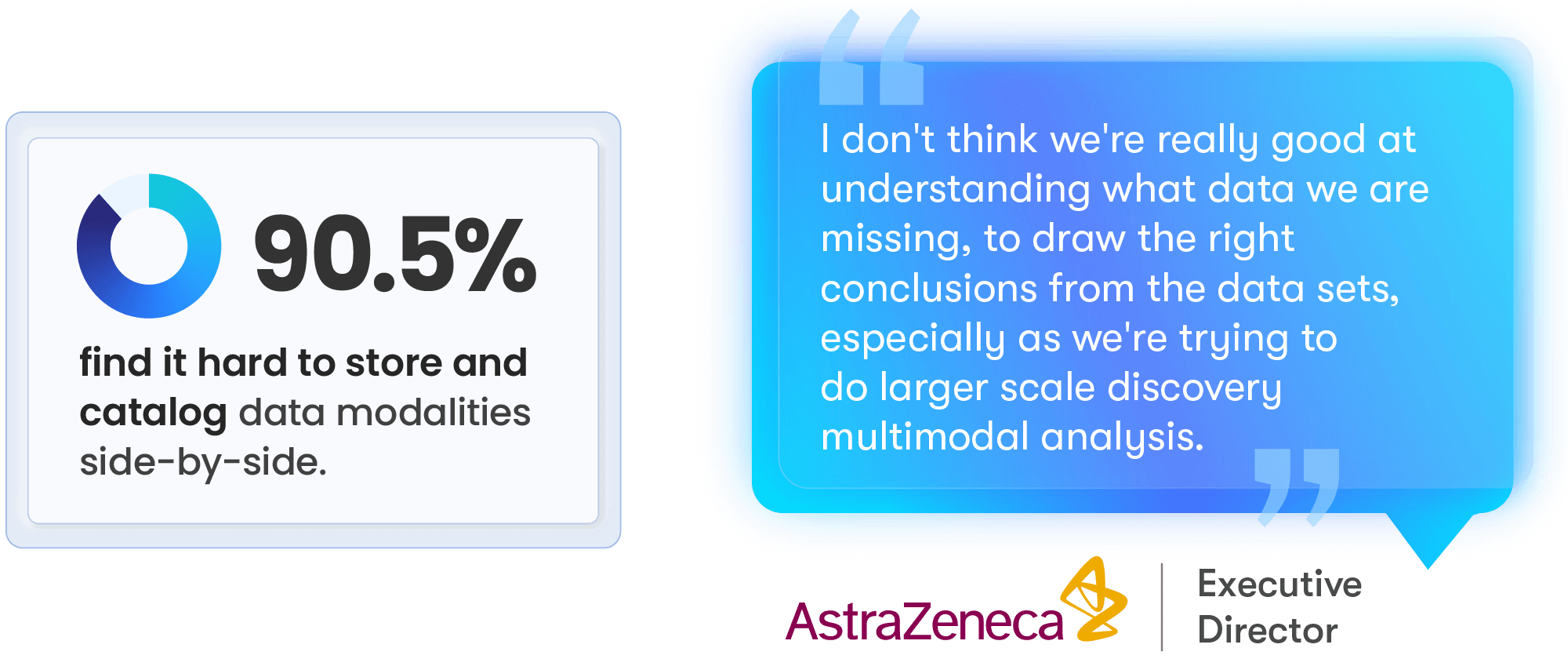 This data management bottleneck is sadly quite common across life sciences firms. 90.5% of life sciences R&D leaders said it’s difficult to store and catalog different data modalities side-by-side. As an AstraZeneca Executive Director describes: “I think we’re really good at understanding what data we have. I don't think we're really good at understanding what data we're missing, to draw the right conclusions from the data sets, especially as we're trying to do larger scale discovery multimodal analysis.” For life sciences organizations to drive transformative change, they must deal with this data management platform problem.